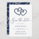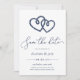 Våra sommarkort vid kusten i bröllop spara datum har en klassisk chic i marin och vit stil. Ett par intilliggande öppna hjärtan som formas med ett knutet nautiskt rep visas överst, med "spara datumet" under modern manustypografi. Anpassa datuminformationen i en chic med serif- och sans serif-bokstäver. Perfekt för nautiska, sommar- eller strandtemat bröllop. Spara datumkorten bakåt till en mönster av det loopande vita repet på marinblått.