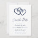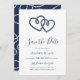 Våra sommarkort vid kusten i bröllop spara datum har en klassisk chic i marin och vit stil. Ett par intilliggande öppna hjärtan som formas med ett knutet nautiskt rep visas överst, med "spara datumet" under modern manustypografi. Anpassa datuminformationen i en chic med serif- och sans serif-bokstäver. Perfekt för nautiska, sommar- eller strandtemat bröllop. Spara datumkorten bakåt till en mönster av det loopande vita repet på marinblått.