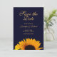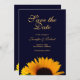 Ett glansfullt och elegant marinblått spara datum meddelande med solrosfotografi som bakgrund. Perfekt för att tillkännage en sommar eller solrosblomma i bröllop, eller för andra tillfälle och evenemang, som årsdagen party eller något slag av blommigt.