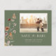 Grönt foto Blommig Spara Datum Postkort. Detta stilrena & eleganta fotobesparing datum ankomstkort har vackra handmålade akvarellblommor arrangerade i en vacker bukett perfekt. Hitta matchande föremål i Sage Green Boho Wildflower Wedding Collection.