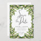 Enkelt datumkort, trädgårdsbröllop, brudens gröna stationära, gröna blad botaniskt kort