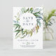 Detta sommarspar-kort med grönska är perfekt för en elegant midsommarbröllop. Den botaniska designen har en frodig arrangemang av målad akvarell eukalyptus, grönska och gröna blad med subtila kvistar av rosafärgade blommor.