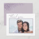 I den här samlingen används ett handskrivet, namnteckning teckensnitt i kombination med geometriskt ramar, gnistrande bakgrunder och lush-blommigtar för att ange en varm och intim ton för bröllop. Bröllop-kortet "Tack" som visas här, med ett enkelt bildat foto på vit bakgrund, har också ditt namn, bröllop-datum och ett personligt tack för ditt meddelande på motsatt sida med en glatt ljus bakgrund. Sök i ID889 om du vill visa alla produkter i den här uppsättningen för bröllop.