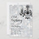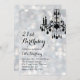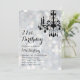 En utsmyckad ljuskrona på en bakgrund av silvrigt ljus betonar denna födelsedaginbjudan.