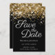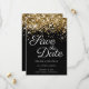 Skapa din egen moderna stil bröllop spara datum. Faux glam glam kant vid glam guld på fast svart bakgrund. Hela struktur i i form av skal, gnistra, metall och glitter skapas med en tryckt digital grafisk bild. Teckensnittet stil och färg kan anpassas.