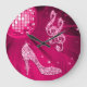 Eleganten den glamorösa väggen tar tid på. Härlig och att blända, avbildar den utskrivavna trendiget shock rosasparklesdiamanter som bling juvlar som, musikalen noterar, skraj retro diskospegelboll, och mode för stilettkickhälet skor på en utskrivaven chic shock rosa avbildar bakgrund. En gullig, flott, trendig, stilfull nätt gåva för henne eller någon musikälskare. Ska kvinnor och tonårs- flickor älskar denna coolt, roligt, funkyn, flickaktigt design.
