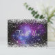 Skapa ditt eget tack för elegantens födelsedag. Faux shiny silver glitter med gnistor mot ett strålande svart, blått och lila celestial-foto. Alla glänsande silkesglittrande glatta effekter i denna moderna gigantiska design skapas med digitalgrafik. En kreativ som är utformad för att fira din kalender. Du kan byta ut den kosmiska rymdbilden mot din egen om du vill.