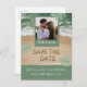 Sagegröna och teal moderna strandvibbar med foto, spara datumet i sandbokstäver och personligt foto. OBS: Text, teckensnitt, färger och element kan anpassas helt med hjälp av designverktyget.