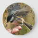 Sparrow landar på min frus hand stor klocka