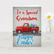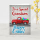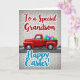 Det här kortet visar en klassisk röd pickupbil sedd från sidan, placerad mot en svagt strukturerad ljust grå tegelvägg, och rullar längs en mörk väg markerad med korta vita streck. I flaket sitter en hög med överdimensionerade äggformer i limegrönt, klarblått och magenta, några med tunna ränder och en högglansig yta 🐰. Scenen känns vänlig och tillgiven, som en liten överraskning som levereras, med lastbilen riktad framåt som om den är på väg rakt till någon särskild. Nära toppen visas texten ”Till en speciell sonson” i röd text med en tunn vit kant, centrerad ovanför konstverket. Nära botten står ”God Påsk!” med stora turkosa bokstäver med vit kant, som sticker ut tydligt mot den neutrala bakgrunden 🌷. Den djupt röda lastbilen kontrasterar mot de pastellfärgade äggen och ger hela layouten en festlig känsla utan att det blir för rörigt. Det ljusa tegelmönstret förblir mjukt och jämnt bakom