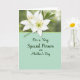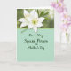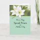 Denna design visar två stora vita blommor högst upp, med mjuka kronblad som öppnar sig runt små gul-orangea centra som en mjuk glöd, med smala gröna blad inklämda vid sidan. Bakom dem skapar en suddig tvätt av lövgrönt en lugn trädgårdsmiljö där blommorna tycks luta sig mot varandra på ett ömt och intimt sätt ❤️. En tunn horisontell linje i en djupare grön nyans löper tvärs över mitten och skiljer blomscenen från meddelandeområdet nedanför. Den nedre sektionen är en blek mintgrön med en subtil tyg-liknande textur som känns lugn och välkomnande. Centrerad i detta mintområde står texten “For a Very Special Person on Mother's Day” i mörkgrönt, flödande bokstavsstil, jämnt fördelat så att det är lätt att läsa. Orden vilar bekvämt i mitten med generöst öppet utrymme runt omkring, vilket ger meddelandet utrymme att andas 🌼. En slank blomstjälk doppar