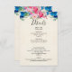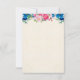 Kort för djurutrymme i bröllop med ett botaniskt gräns med rosa ros och peonier och blå pansier. Bakgrund är en faux-parchment-bild. Färgstark och ljusstark. Skitsam och summerös.