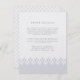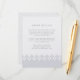 Designat att samordna med vår marockaninspirerade Arabesques bröllopsinbjudan, innehåller det här enkla och chic gästinformationskortet elegant grått-brev accentuerat med ett geometriskt gräns längs grund i blek, silvery grått. Byt ut exempeltexten mot nyckel i bröllop firande. Vi rekommenderar att du skriver ut stil på Luxe Pearl Shimmer pappert för en luminös metallavsluta. Vilka uppgifter ska ingå i en bröllopsinbjudan? Ta hänsyn till information som hotellrum, gruppkoder, transport, anvisningar, välkomstmottagningsinformation och bröllop webbplats-URL. Du kan till och med överföra en karta till motsatt sida med hjälp av anpassningsfunktionen. Behöver du hjälp med formuleringar eller formateringar? Jag vill hjälpa kärlek! Kontakta Kristen via länken "fråga den här designern".
