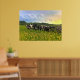 Denna poster består av en rad svarta och vita speckle Park-boskap som står bakom ett taggtråd med gult ogräs i förgrunden och en delvis turbulent grått himlar blandad med sol bakom. Det skulle vara en perfekt av färg var man än visningar det.