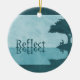 Ett grönt-blått texturerat teckning med en silhuett av en man sitta under träd under en damm som funderar på. "Reflect" från ord vilar på sjö yta, texten och skuggorna som speglas i det helt stilla vatten.