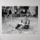 Ett gammalt foto av söt ung flicka på stranden på 1920-talet i baddräkt, med en possor som inte ser ut som lycklig. Nice 1920-talet mode bild.