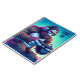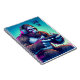 Lönsam bärbar dator med en illustration av en psykedelisk bigfoot-lek med hörlurar på. Lila och blå nyanser och text som säger att du spelar på men kan vara personlig.