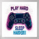 Spela upp hårddisk - Bilden har en stiliserad bild av en svart 4-spelarfjärrkontroll mot en vit bakgrund. Styrenheten visas i en 3D-stil med rosa och blå neonkonturer, vilket skapar en levande och energisk känsla. Orden "Play Hard" visas ovanför styrenheten i ett fet, nyare rosa-teckensnitt, medan "Sföreliggande Harder!" skrivs nedan i ett ljusblått teckensnitt.