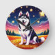 En levande färglös grafik som skildrar ett lycklig Siberian husky under en magisk, stjärnbelyst kväll himmel blommar i en serenängsskugga och som visar en viskös harmoni mellan natur och lekhet.