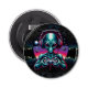 Alien spelar videospel med hörlurar på och handkontroll. Färgfull utomjordingskonst.