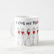 Netballspelarestick figur, med röda hjärtor på kaffemuggen. Också på t-skjortan och gåvor. Would gör en underbar gåvaidé för en netballlagledare, spelare eller fläkt.