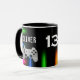 Spelspelets videospelsstyrenhet Neon Namn Age Mugg. Spelkontroll på en levande, färglös nybörjare ljus mot svart bakgrund. Lägg till ditt namn och din ålder. Underbar som en födelsedagspresent till en riktig spelare.