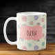 Det här förtjusande personlig mugg har massor av enkla hjärtan, prickar och vågigt linjer som är målat med mjuka pastellvattenfärger i gulten för rosa, grönt, lavender och blek.