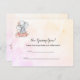 Bekvämt flicka-elefant med blommor ovanför örat och en blommigt andningsspray under hennes tår. Koral och vattenfärgsbakgrund för rosa med blommigtens hörn. Nära med matchande inbjudningar för valfri typ av greve Guessing-spel i party.