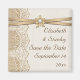 Elegant vit spets, band och blomma på burlap bröllop Spara datum med vit spets på linne naturlig burlap eller hessian med två korsade satinband och blomma i beige med metallisk glans och en vit ädelsten. Text i brunt. Observera att spets, burlap, blomma och ädelsten alla är "tryckta på" och inte riktig tyg, ädelsten eller kristall. Denna eleganta, sofistikerade och romantiska design med en rustik essens är en del av en bröllopssats och är perfekt för ett country chic eller västerländskt vår-, sommar- eller höstbröllop med en neutral färgpalett.