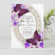 Dessa vackra vita spetsbröllopsinbjudningar har fjärilar och lila blommor och rosa krämrosor. Perfekt för ett rustikt landbröllop eller för en DIY-bröllopsfirande. Mycket elegant.