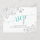 Dessa vackra RSVP-kort gör det enkelt för dina gäster att svara på din bröllopsinbjudan. De har en elegant design med vit bakgrund och akva-, cyan- eller klar turkos färgad, spetsig, kalligrafisk skrift och vackra, silverfärgade, falska blomsterkrullar och -svirlar i hörnen. Baksidan är ett formulär som dina gäster fyller i och returnerar med angivande av antal deltagande och deras val av måltider. Det finns utrymme för att ange en webbplats så att dina gäster kan svara online om de föredrar det. Klassiska och sofistikerade, dessa RSVP-kort är ett underbart tillägg till din inbjudan.