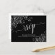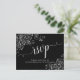 Dessa vackra svarta RSVP-kort gör det enkelt för dina gäster att svara på din bröllopsinbjudan. De har en elegant design med spetsig, kalligrafisk skrift och vackra, silverfärgade falska foliekrullar och -svirlar i hörnen. Baksidan är ett formulär som dina gäster fyller i och returnerar med angivande av antal deltagande och deras måltidsval. Det finns utrymme för att ange en webbplats så att dina gäster kan svara online om de föredrar det. Klassiska och sofistikerade är dessa RSVP-kort ett underbart tillägg till din inbjudan.