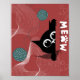 En charmerande grafik som visar en svartvit katt med vidsynta ögon och som pissar på ett misskött sätt från sidan, mot en varm rödaktig bakgrund. Vit snurrande linjer ger upphov till katodliknande rörelser, medan bollar av garn och geometriska accenter förorsakar energi och roligt. Den fet ord "MEOW", som är skriven med ett paprecept, kompletterar utformningen, reflekterar nyfikenhet och kattdjurets spelbarhet