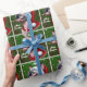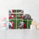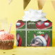 En söt shynx-katt bär ett rött jultak. Bakgrunden är en stjärnande grönt mönster.