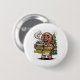 A joyful, cartoon-style Gingerbread Man, depicted with a wide, enthusiastic smile and rosy cheeks. He's wearing a simple white apron and heartily holding up a clear mug filled with dark, steaming coffee, with a prominent plume of steam curling upwards. The text "Spicy and Caffeinated" is creatively integrated onto the coffee mug in a bold, vibrant, multi-colored font, featuring subtle star and flake embellishments. In the background, a minimalist yet festive green Christmas tree is adorned with red and gold baubles, topped with a star, and radiating faint yellow light rays. The overall style is clean, cheerful, and graphically strong, with clear outlines.
