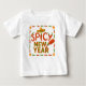 Rolig t-shirt för småbarn att fira nyår med. Söt design med röda och gröna chilipeppar, het sås, flamma-emojier, en sombrero och meddelandet "Spicy Nyår". Ditt lilla barn kommer garanterat att bli festens stjärna!