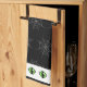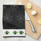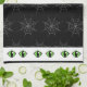 Den här visuella designen är perfekt för ditt Halloween-köksskåp. Den har en mönster av grått-spindelnät över en svart bakgrund. Den här handdukens överkant och grund har ett vitt band med grönt ögon.