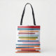 Den här väskan har ett modernt mönster i mitten av århundradet av vågrät färgad linjer på ett lodrät svart linje med cirklar.m.