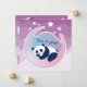 Cute card med en panda sovande på måne, vita stjärnor och lila grumlig bakgrund. På baksidan anpassar du kortet med ditt baby-foto och födelseinformation.