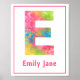 Cute print for nursery or kid's room features multi-colored splatter paint letter E with customizable pink text and a thin pink border frame.