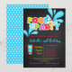 En bassängpartyinbjudan med en svart svart tavlabakgrund. Bassängpartyet är i färgrik polka pricker brev. Det finns alla stänk av vatten runt om "bassängpartyet". Personifiera med information om party.