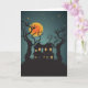 Spökat kort för husHalloween hälsning som presenterar spöklika träd som är fastställda på en midnatt blåttbakgrund med en ljus orange måne.