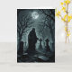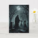 Ett svart spöke står på en gravsten, på en kyrkogård under fullmåne, på detta kusliga Halloween-kort.