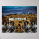 Svart-vita multipla porträtt av kända ikoniska skådespelare överlagras över det ikoniska Hollywood på dess bergiga bakgrund. Juxtapositionen framhäver en blandning av klassisk film med det tidlösa landskapet i Los Angeles.