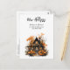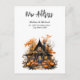 Vykort flyttmeddelande med en cool och kuslig illustration av ett trähus spökhus. Omgiven av stora orange pumpor och träd med orange blad. Fönster med orangea ljus ger en fin glöd. Rolig Halloween-design.