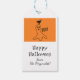 Snygga anpassade Halloween-present/partyfavor-märken! Orange och vitt på framsidan med en snygg spökis som säger Boo medan en svart katt sitter på hans huvud. I två typsnitt (ett roligt teckensnitt och ett skrivstil) står orden "Glad Halloween från <Custom Family Name>!" Baksidan är orange med orden Glad Halloween i vitt. Klassiskt, klassiskt och roligt!
