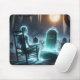 En spöklik manlig figur sitter i en gungstol, vänd mot en gravsten märkt "R.I.P." under fullmåne
