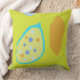 Den här kudden har uttryckliga och spontana konstnärliga prickar och polka dots i orange, vitt, blått och turkos. Bakgrunden är ren, grön gult.