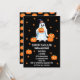Inbjudan dina små själar och gobliner till en roligt fylld Halloween Bash med denna vackra inbjudan med ett sött tecknad spöke som håller en pumpa och bär ett Halloween-lock. Perfekt för att ställa in den skämtsamma tonen för ditt barns Halloween fest!