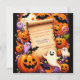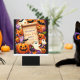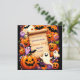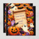 Utformningen har en parchment-rulla för åldras i mitten, vilket ger ett tomt utrymme för text. Omkring rullan finns olika Halloween-temade ikoner, inklusive leende jack-o’-lyktor, spöken med olika uttryck, candy corn, Halloween-färgad-lollips, svarta spindlar och fladdermus. Bakgrunden är en djup lila med subtle star mönster, som skapar en lekfull perfekt med spooky atmosfär för en Halloween-inbjudan.
